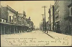 Around that time Clarksburg gained some industry and manufacturing, particularly involving glass and coal.[16] The city grew slowly but steadily, and services increased apace. The still-functional Despard Building was built in 1870. Telephone service, the first in the state, began in Clarksburg in the mid-1880s. Native son Edwin Maxwell was the Republican nominee for Governor of West Virginia in the 1884 election, though he lost narrowly to Emanuel Willis Wilson. In 1887, Clarksburg laid its first six miles of water lines; downtown streets were lit by electricity in 1889. Nonetheless, in the late 1890s, a visitor called Clarksburg a "sleepy, moss-covered town."[17]