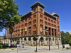 In 1894, the Traders' Hotel was constructed, the grandest structure to date. Many buildings in the Clarksburg Downtown Historic District date from that era. In 1900, the first sewer lines were installed, and Main and Pike streets were paved with brick. In 1901, the city's first trolley opened for business (it would cease operating in 1947). Merchants Smith, Brown and Company built an early department store beginning in 1890. The Northwestern Academy was razed in 1894 and the Towers School erected (which became the city's high school). Merchants National Bank built a building in 1894 which later became the Community Bank. Clarksburg's oldest bank, the Empire National Bank, built a seven-story headquarters in 1907. Other significant buildings include the Goff Building (1911), Municipal Building (1888), the Waldo Hotel (1901–1904), Robinson Grand (1912, 1940), Harrison County Courthouse (1931–1932), U.S. Post Office (1932), Masonic Temple (1911–1914), First United Presbyterian Church (1894), and First Methodist Church (1909, 1956).[19][18]