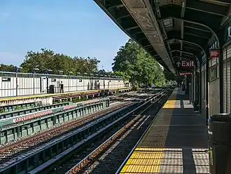 Situated on an elevated embankment, Avenue M station has two side platforms and four tracks. The side tracks provide the local service to this station, while the two center tracks, used by the B express train on weekdays, bypass the station.[12] This layout, as well as many other station features, closely resemble many other local stations on the elevated portion of the line, especially the Avenue J station.
