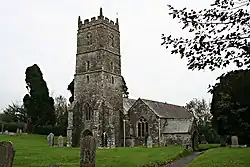 The parish church was consecrated in 1333 and apart from the upper stage of the tower and the south aisle is entirely of this date (the additions are 15th century). The font is Norman and a fine example of the Bodmin type (carved with four faces, trees and curious creatures); in the churchyard is an inscribed stone of the 6th or 7th century. The tower is topped by figures of the Twelve Apostles.[3] Callington was formerly in the parish of South Hill.[4] St Sampson's well is supposed to have been either near the church in the grounds of the former rectory,[5] or in a nearby valley in a stream leading to the river Lynher.[6]