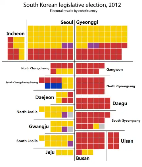 Legislative elections were held in South Korea on 11 April 2012. The election was won by the ruling Saenuri or New Frontier Party, which renewed its majority in the National Assembly,[1] despite losing seats. The election was read as a bellwether for the presidential election to be held later in the year.[2] The result confounded exit polls and media analysis, which had predicted a closer outcome.[3]
