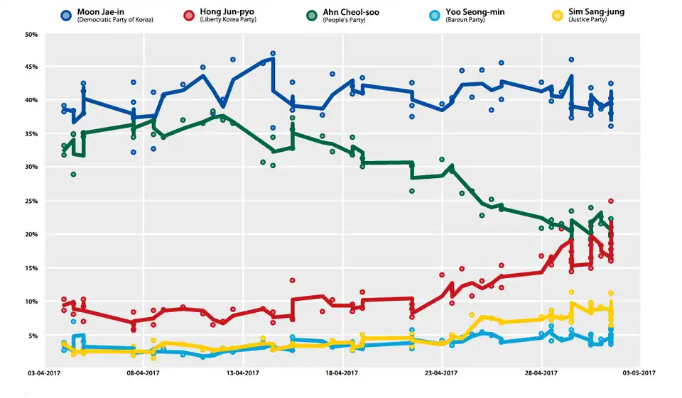 Opinion polling before April consistently placed the Democratic Party's candidate, Moon Jae-in, runner-up in the 2012 election, as the front-runner. Second place in the opinion polls was initially held by former UN Secretary-General Ban Ki-moon, who declined to run in February, followed by Ahn Hee-jung, whilst he lost the Democratic primaries to Moon. Support for People Party founder Ahn Cheol-soo then surged, threatening Moon's lead in the polls throughout early April, before descending to approximately equal that of Liberty Korea Party's candidate, Hong Jun-pyo, in final polls.