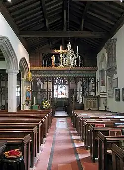 In 1552 the church possessed a pair of organs. A barrel organ had been introduced in 1813, although the innovation was not welcomed by all the parishioners, and a new organ was built in the chantry in 1889. The square baptismal font dates from the 13th century and has 14th-century panelling on the pier. Its cover, designed by Sir Ninian Comper in 1938, is supported on four gilt pillars.[9]
