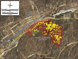 The South Mountain Oil Field is a large and productive oil field in Ventura County, California, in the United States, in and adjacent to the city of Santa Paula. Discovered in 1916, and having a cumulative production of over 165 million barrels (26,200,000 m3) of oil out of its original 630 million, it is the 37th largest oil field in California and the second largest in Ventura County (after the Ventura field).[1] As of the beginning of 2009, it retains 316 active wells, and has an estimated 1.4 million barrels (220,000 m3) of oil remaining recoverable with current technology. Vintage Production, a subsidiary of Occidental Petroleum, was the largest operator as of 2009.[1]