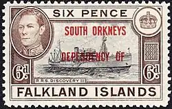 In 1908, the United Kingdom declared sovereignty over various Antarctic and South American territories "to the south of the 50th parallel of south latitude, and lying between the 20th and the 80th degrees of west longitude", including the South Orkney Islands.[2] The Islands were subsequently administered as part of the Falkland Islands Dependencies. A biological research station on Signy Island was built in 1947 by the British Antarctic Survey, and was staffed year-round until 1996, when the Station staffing was reduced to 8–10 personnel who remained only during the southern hemisphere summer (November to April each year). In 1962, the islands became part of the newly established British Antarctic Territory.