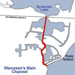 The main channel is not officially part of Lake Wawasee but does perform as an outlet for water heading north. The main channel begins at the lake's northwest shore with Oakwood Park on its west and Kale Island on its east and flows north through Mudd Lake and finally into Syracuse Lake. The main channel is lined with homes and a marina on its west for its first third of travel. On the channel's east side is a large wetland marsh where a gristmill once stood.