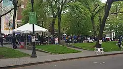 In May 1970, there was a Vietnam War protest held in the park blocks, held in response to the invasion of Cambodia and the Kent State Shootings.[130][131][132] Strikers barricaded streets surrounding the university and Park Blocks, causing them to become car-free, as they are now.[131] Due in part to the Kent State Shootings on May 4, and 134 faculty members who had formally joined the strike, Portland State University was forced to close from May 6 to 11.[131][133] By May 6, the protesters formed an underground newspaper, called the Wallposter, and had four demands: "U.S. out of S.E. Asia now; troops, cops off campus; free Bobby Seale; detoxify nerve gas."[131] Posters with a logo were printed in the PSU Smith Center cafeteria, but protesters were evicted from the area by May 7 after a "wild, all-night party".[131] On May 11, police officers charged[134] protesters and forcibly removed a symbolic hospital tent (a geodesic dome) placed on the blocks.[131][133][135] 28 protesters were injured and taken to area hospitals, and four police officers were injured.[133][136] Lawsuits following the protest led to Portland Police agreeing to never use force against non-violent protesters in the future.[131]
