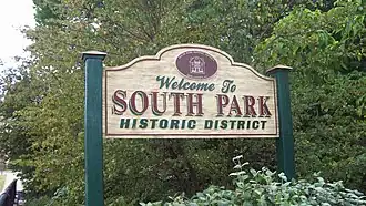 South Park Historic District is a national historic district located at Morgantown, Monongalia County, West Virginia. The district includes 501 contributing buildings and 5 contributing structures in a primarily residential area south of downtown Morgantown. The district is characterized by tightly packed dwellings on a hillside and represent a variety of post-Victorian architectural styles popular between 1900 and 1940. Notable buildings include the First Church of Christ, Scientist, Morgantown High School, Crestholm Pharmacy, and Bobbette's Confectionary.[2]
