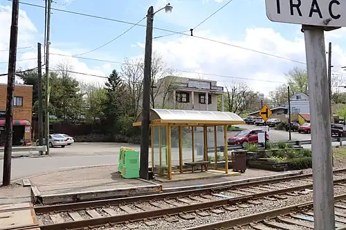 A rebuilt PAT PCC streetcar, No. 4007 is on display in front of the Schoolhouse Arts Center, 100 yards (91 m) east of the station. This trolley operated on the route before it was converted to Light Rail operation. The rebuild car number has been removed at the request of a local family as this vehicle was involved in a fatal accident whilst operating on the 47 Drake route.[2] However, it was later given the number 1729 (thought to be its original number), but this was later found to be in error and at some point the car may be renumbered to its actual original number of 1719.[3]