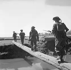 The 2nd Battalion returned to the United Kingdom and, on 7 December 1941 (the day the United States entered the war), transferred to the 37th Independent Infantry Brigade (redesignated 7th Infantry Brigade the day after).[44] On 1 March 1944 the battalion was transferred to the newly created 56th Independent Infantry Brigade, alongside which were the 2nd Battalion, Essex Regiment and 2nd Battalion, Gloucestershire Regiment and trained for the invasion of Normandy. The battalion had the distinction of being the only Welsh battalion to take part in the Normandy landings on 6 June 1944, landing at Gold Beach under command of 50th (Northumbrian) Infantry Division and fought in the Battle of Normandy, under command of 7th Armoured Division for a few days in June 1944, before reverting to the 50th Division.[43] In August 1944 it was briefly under command of the 59th (Staffordshire) Infantry Division and fought in the Battle of the Falaise Gap.[43] On 20 August the brigade joined the 49th (West Riding) Infantry Division, replacing the disbanded 70th Brigade. With the division, the battalion fought in the operations to clear the Channel coast, where they captured Le Havre in Operation Astonia.[43] Afterwards the battalion enjoyed a short rest and, on 22 September, moved to join the rest of the 21st Army Group fighting in Belgium. In October, shortly after the failure of Operation Market Garden, the division was sent to garrison the "Island", as the area of land between Arnhem and Nijmegen was known, where it remained throughout the northern winter of 1944/45. The last major action for the battalion was in April 1945 when, with the rest of the division, they fought in the Second Battle of Arnhem.[43] The battalion ended its war in Germany, and remained there, as part of the occupation forces, until 1948 when it returned home. During the campaign in North-western Europe the battalion had suffered over 100% casualties.[43]