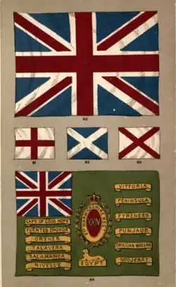 - Early wars: Blenheim, Ramillies, Oudenarde, Malplaquet, [Egypt]1, Cape of Good Hope 1806, Talavera, Busaco, Fuentes d'Onor, Salamanca, Vittoria, Pyrenees, Nivelle, Orthes, Peninsula, Chillianwallah, Goojerat, Punjaub, South Africa 1877-8-9, Burma 1885–87, South Africa 1900-02