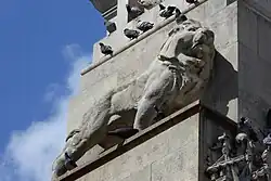 The pillar itself culminates in a series of diminishing tiers between the main body and the sarcophagus. It contains multiple sculptural details—a cross bearing a sword is engraved on the front (east) face of the largest (second) tier, on the tier above on the front and rear is carved Southampton's coat of arms, and on the fourth tier a lion stands on each side. Finally, on the fifth tier, below the sarcophagus, are wreaths which each contain emblems, representing the British Army, the Royal Navy, the Royal Air Force, and the Merchant Navy. The pillar is slightly curved (entasis) in imitation of the pillars at the Parthenon in Athens, and a similar effect was later repeated by Lutyens at the Whitehall Cenotaph. Besides the names of the dead, the only inscription on the cenotaph reads OUR GLORIOUS DEAD; The Stone of Remembrance is inscribed THEIR NAME LIVETH FOR EVERMORE, a phrase from the Book of Ecclesiasticus chosen by Rudyard Kipling.[12][19] The names of the dead are cut into recessed panels on the north, south, and west faces.[14][17]