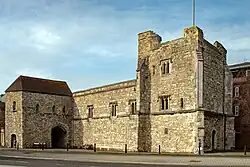In the south-east corner of the walls is God's House tower. This is architecturally important as it was one of the first urban buildings to be built to hold gunpowder artillery – in this respect, it closely resembles Cow Tower in Norwich.[68] The tower was built alongside God's House Gate and is three storeys high.[69] The gunports designed for handcannon can be seen on the outside, and the roof was designed to hold larger cannon.[69] Adjacent to the tower is God's House Gate, a two-storey building also equipped with a gun-port.[65]
