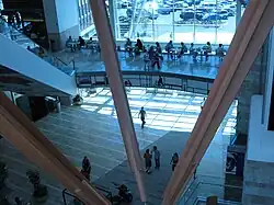 A view inside the atrium, looking down from the 3rd floor. Patrons eating at the dining terrace can be seen at top center.