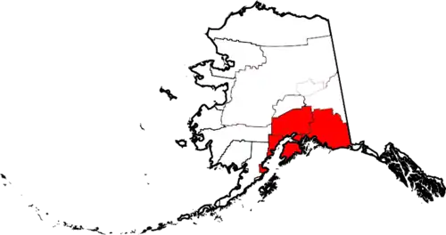 Southcentral Alaska (Russian: Юго-Центральная Аляска), also known as the Gulf Coast Region,[1] is the portion of the U.S. state of Alaska consisting of the shorelines and uplands of the central Gulf of Alaska. More than half of the state's entire population lives in this region, concentrated in and around the city of Anchorage.[2] The region is Alaska’s best-connected region, with the Port of Anchorage, Ted Stevens, Anchorage International Airport, and the Alaska Railroad servicing the area.