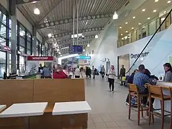 The current terminal was built in 2012 as a part of the Stobart Group's development upon taking over the airport. It has twelve check-ins, two floors, ten departure gates and two baggage claims. There are several amenities such as shops and places to eat and drink.[102]