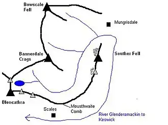 The western side of the fell stands above the enclosed valley of the upper Glenderamackin, looking across to Bannerdale Crags. Souther Fell has two principal tops and each stands above a patch of scree and rock on this face. A footbridge crosses the river just north of Mousthwaite Comb, the only reliable crossing between here and Mungrisdale village.