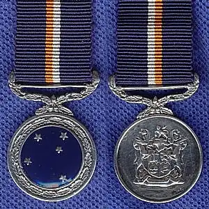 The Southern Cross Medal of 1952, post-nominal letters SM, is a South African military decoration which was instituted by the Union of South Africa in 1952. It was awarded for outstanding devotion to duty and was originally available to all ranks, but from 1967 until July 1975, when it was discontinued, it was reserved for officers.[1]
