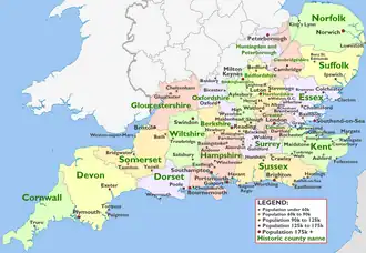 Southern England, also known as the South of England or the South, is a sub-national part of England. Officially, it is made up of the southern, south-western and part of the eastern parts of England, consisting of the statistical regions of London, the South East, the South West and the East.[1] The region also shares a border with Wales to the far North West. Altogether, it forms a population of nearly 28 million and an area of 62,042 square kilometres (23,955 sq mi).