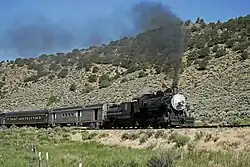 On April 22, 1980, No. 1744 was purchased by the New London and Village Incorporation, and it was moved by truck to Heber City, where it was given a major rebuild in the locomotive shops. In the Labor Day weekend of that year, No. 1744 was back under steam and was ready to operate on the Heber Creeper Tourist Railroad (HVRX).[8] There, No. 1744 would operate alongside some other active steam locomotives, including Union Pacific 2-8-0 No. 618, Sierra Railway 2-8-2 "Mikado" No. 36, and Santa Maria Valley 2-8-2 No. 100. No. 1744 would also perform some famous doubleheaders with the other locomotives, which would also only happen on Labor Day weekends. As the decade progressed, however, the Heber Creeper was running into some financial trouble, and they slowly struggled to operate any more trains. No. 1744 made its last run in Heber on December 3, 1989, when it pulled the Santa Claus Express, and its fire was dropped once again and put into storage.[1]