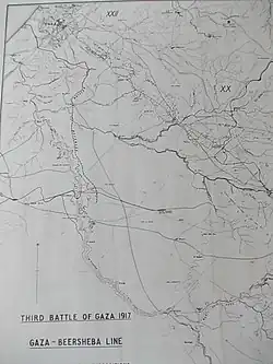 By 31 October, nine Ottoman infantry divisions and one cavalry division with a total strength of up to 45,000 rifles, 1,500 sabres and 300 guns defended the Gaza to Beersheba line. Gaza was defended by the Eighth Army's XXII Corps, with its XX Corps defending Sheria, while the Seventh Army's III Corps defended Beersheba. The recently arrived commander of the Seventh Army, Fevzi Pasha, "played no active role in command during the early stages of the third battle of Gaza and the entire front remained under Kress's control."[33]
