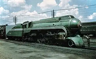 On May 17, 1941, SOU introduced their brand-new public streamlined Tennessean passenger train, which replaced the Memphis Special that ran between Washington, D.C. and Memphis, Tennessee.[12][13] It was frequently hauled behind SOU's new EMD E6 diesel locomotives,[14] but the Tennessean ran via Norfolk and Western (N&W) rails between Monroe, Virginia and Bristol, Tennessee, and N&W would not allow diesel locomotives running on their rails.[4][15] The SOU did not want get all tied up with their E6s pulling the Tennessean between Washington D.C. and Monroe.[4][15] They decided to streamline one of their Ps-4 locomotives to pull the Tennessean consist.[4][16] The result was No. 1380, which was scheduled for repairs at SOU's Spencer Shops in Spencer, North Carolina, and was given a streamlined design created by industrial designer Otto Kuhler.[4] Despite Kuhler being impressed with his design on No. 1380, SOU did not pay him at all.[4]
