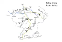 River of South Morava runs though the whole territory of Southern Serbia from Ražanj to Bujanovac. The river cuts the region in the middle into two parts. The basin of South Morava occupies approximately the same territory as the region of commonly considered to be Southern Serbia. Therefore, Southern Serbia is sometimes referred to as Southern Pomoravlje.[9]