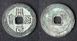 Under the reign Emperor Li Jing who first used the reign title Baoda (保大), cash coins were cast both in bronze and iron with the inscription Baoda Yuanbao (保大元寶) from the year 943 until 957,[2] however the bronze variants are extremely rare. In the year Xiande 5 (962) Li Jing cast the Yongtong Quanhuo (Chinese: 永通泉貨; pinyin: yǒng tōng quán huò; lit. 'Eternally circulating coin') which had a nominal value of 10 smaller bronze cash coins, however they only weighed 40% of how much value 10 cash coins usually weight.[4] Li Jing was short of funds for his army at that time. These cash coins were cast in both clerical ("official style", 隸書, lì shū) and seal script (篆書, zhuàn shū). Some of the cash Coins with inscriptions in seal script are diminutive in size and lightweight. Li Jing’s minister Zhong Mo obtained permission to cast large coins, one of them being equal to ten smaller coins, with this inscription. In 964, the coin was withdrawn when Zhong Mo incurred the displeasure of the Emperor.[2] It is also possible that the Yongtong Quanhuo cash coins were cast at a later date. As the people weren't used to fiduciary coinages they weren't accepted on the marked with their intended value.[4]