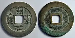 - ^ In Clerical (Li) script. Distinguished from Tang dynasty period Kaiyuan Tongbao cash coins (Hartill #14.1 &c) by the broader rims, and the characters being in less deep relief. Reverse: Plain.
