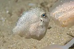 The fish is a small leatherjacket with a round, almost circular body, growing to a maximum of 9 centimetres (3.5 in). They are able to inflate their abdomen.[2]