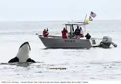 The research vessel Noctiluca of the Northwest Fisheries Science Center in close proximity to an orca