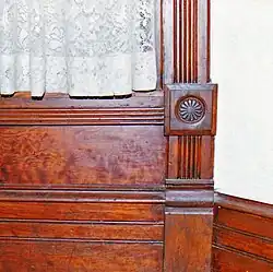 The restoration work on the interior of the Southgate–Lewis House revealed many unexpected findings: an elaborate staircase balustrade, beaded tongue-in-groove (tongue and groove) hardwood paneling, patterned brass hardware, wainscotting, and wood floors from old-growth heartwood longleaf pine, from the Calcasieu Pine District of Louisiana.