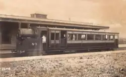 Railcar no 1 was carried on two bogies, a motor bogie and an ordinary bogie; each had solid centre wheels 2 feet 9 inches (84 cm) in diameter and with a wheelbase of eight feet (2.4 m). The boiler was of the vertical type with vertical and cross tubes, but it was replaced with a boiler of conventional type. The new boiler had an outside diameter of 16+1⁄2 inches (42 cm) and was 3 ft 6 in (1.07 m) long. The grate area was 6+3⁄4 square feet (6,300 cm2) and the two cylinders driving on the leading wheels were seven inches (18 cm) in diameter by 10 inches (25 cm) stroke. Electric bell communication was provided between the car and the driver's cab. The coach provided accommodation for ten first class passengers on upholstered longitudinal seats, and 32 third class passengers on rush top seats, arranged laterally with the gang way between. All entrances and exits were closed by trellis gates. The driver's rear compartment had the normal controls. Car No. 1 started running on Whit Monday 1 June 1903.