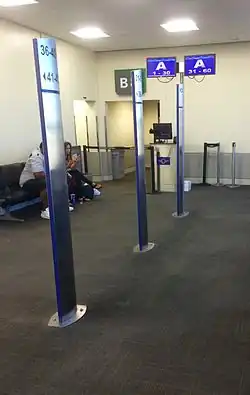 Southwest currently has an open seating policy, scheduled to end on January 26, 2026,[23] and uses a unique boarding process. Passengers are given a group letter (A, B or C) and a number (1 through 60). Passengers lineup in numerical order within each letter group and choose any open seat on the aircraft.[24] A 2012 study on the television series MythBusters, found this to be the fastest method currently in use for passengers to board a plane; on average, it is 10 minutes faster than the standard method.[25]