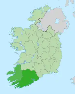The South-West is a strategic planning area within the Southern Region in Ireland. It is a NUTS Level III statistical region of Ireland (coded IE053).[1][2] It includes the city of Cork and the counties of Cork and Kerry. The South-West region spans 12,120 km2 (4,680 sq mi), roughly 16% of the total area of the state and according to the 2022 census has a population of 736,489.[3]