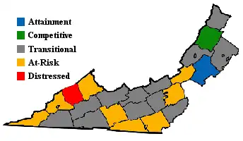 The Appalachian Regional Commission was formed in 1965 to aid economic development in the Appalachian region, which was lagging far behind the rest of the nation on most economic indicators. The Appalachian region currently defined by the Commission includes 420 counties in 13 states, including the westernmost counties and cities in Virginia. The Commission gives each county one of five possible economic designations— distressed, at-risk, transitional, competitive, or attainment— with "distressed" counties being the most economically endangered and "attainment" counties being the most economically prosperous. These designations are based primarily on three indicators— three-year average unemployment rate, market income per capita, and poverty rate. For data collection purposes, independent cities within the designated region are grouped with an adjacent county.[7]