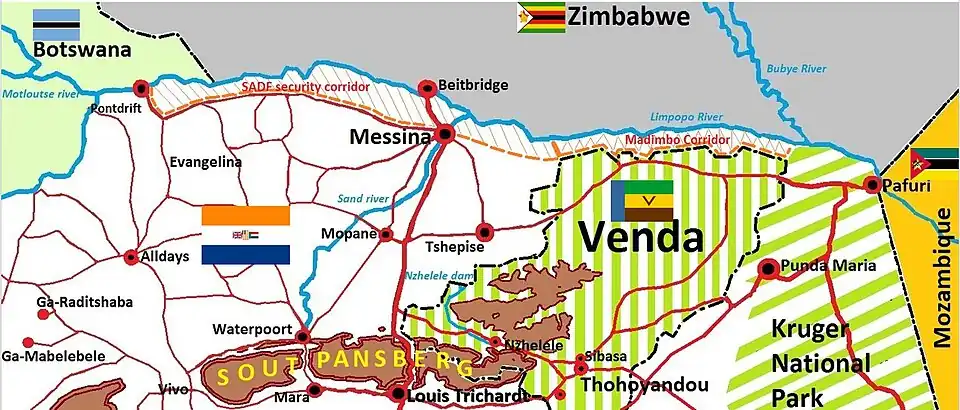 Some parts of the affected area allowed commercial farmers to continue to operate, while others areas, particularly to the east of Messina, were depopulated and became a military exclusive zone called the Madimbo Corridor.[1][2]