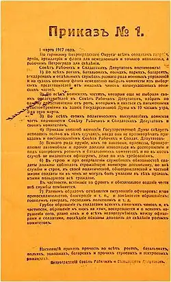 Order No. 1 (Russian: Prikaz nomer odin) was the first official decree of the Petrograd Soviet of Workers' and Soldiers' Deputies, issued on March 1, 1917 (March 14, New Style). It followed the February Revolution and was a response to actions taken the day before by the Provisional Committee of the State Duma, headed by Mikhail Rodzianko. On February 28, the Provisional Committee, acting as a government in Petrograd after the disintegration of the Tsarist authority and fearing that soldiers who had joined the revolution on February 26–27 (O.S.) without their officers (who had generally fled) might become an uncontrollable mob threatening the Duma, issued an order through the Duma's Military Commission. This order called on soldiers to return to their barracks and obey their officers.[1]