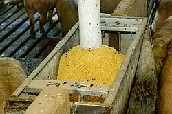 Soybean meal is used in food and animal feeds, principally as a protein supplement, but also as a source of metabolizable energy. Typically 1 bushel (i.e. 60 lbs. or 27.2 kg) of soybeans yields 48 lbs. (21.8 kg) of soybean meal.[1] Most soybean meal is defatted, produced as a co-product of soybean oil extraction.[2] Some, but not all, soybean meal contains ground soybean hulls. Soybean meal is heat-treated during production, to denature the trypsin inhibitors of soybeans, which would otherwise interfere with protein digestion.[3][4]