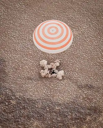 At an altitude of about 10 kilometers, onboard computers started a commanded sequence to unfurl the parachutes. Two "pilot" parachutes deployed first, extracting a 24-square-meter drogue parachute. The parachute deployment reduced the velocity of the Soyuz capsule from 230 m/s to 80 m/s and assisted in the capsule's stability by creating a gentle spin for the Soyuz spacecraft.[22] Once the drogue chute was released, the main parachutes were deployed. They further reduced the descent to 7.2 m/s. Initially, the Descent Module hung underneath the main parachute at a 30° angle with respect to the horizon and for the few minutes before the landing, then following the detachment of the bottom-most harness it hung vertically. At this time, flight controllers reported the Soyuz spacecraft was operating as expected on the automatic sequence. During the same time, they were successful in contacting the crew via the fixed-wing aircraft that served as the central command for the search and recovery forces. The recovery forces spotted the Soyuz TMA-19 around 04:36 UTC. At an altitude of five kilometers, the module's heat shield was jettisoned.