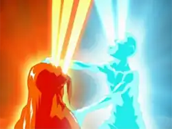 An elemental bending technique new to humans, energybending, is introduced. The blue and orange-colored illuminations represent the intense struggle between purification and corruption, a recurring theme within the series. From a development standpoint, Konietzko said that this scene was particularly difficult to realize.