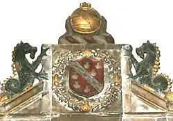 The armorials of the Company were:[7] Azure in base a sea, with a dolphin's head appearing in the water all proper, on the sea a ship of three masts, in full sail, all or, the sail and rigging argent, on each a cross gules, in the dexter chief point the sun in splendour, in the sinister chief point an estoile of the third; on a chief of the fourth, a cross of the fifth, charged with the lion of England. The crest was: On a wreath of the colours, two arms embowed issuing out of clouds all proper, holding in the hands a globe or The supporters were: Two seahorses argent, finned or.