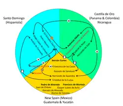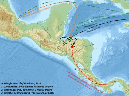 A year after Gil González Dávila's discovery of the Gulf of Fonseca, various Spanish expeditions set out to conquer the territory of Honduras.[27] These expeditions were launched southwards from Mexico and Guatemala,[63] and northwards from Panama and Nicaragua;[64] their rival captains clashed in Honduras, resulting in attempts at conquest of the natives being punctuated by battles between competing Spanish forces, and infighting within individual Spanish groups. The various Spanish groups also fielded indigenous auxiliaries to support their efforts.[63]