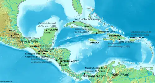 Christopher Columbus discovered the New World for the Kingdom of Castile and Leon in 1492. Private adventurers thereafter entered into contracts with the Spanish Crown to conquer the newly discovered lands in return for tax revenues and the power to rule.[17] The Spanish founded Santo Domingo on the Caribbean island of Hispaniola in the 1490s.[18] In the first decades after their discovery of the new lands, the Spanish colonised the Caribbean and established a centre of operations on the island of Cuba.[19] After the discovery of Honduras by Columbus in 1502, no concerted effort to conquer the territory took place until 1524.[20]