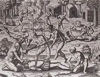 Native warriors primarily used arrows or darts with obsidian points.[45] They also used spears and wooden swords edged with inset flakes of sharp stone (similar to the Aztec macuahuitl), stone-bladed knives, and slings.[46] In response to Spanish incursions, native communities resorted to the fortification of their settlements with palisades and ditches. Palisades were built from rough courses of heavy wood, with openings for shooting arrows. They strengthened their fortifications with towers, and laid out camouflaged pits around the walls as a further defence.[47] The construction of fortified settlements was not common in Honduras until after Spanish contact, although fortifications were known from contact with Maya groups to the west.[48]