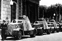 Mola did not believe in a smooth, bloodless coup and did anticipate resistance. He included artillery and pioneers with explosives in advancing columns; he also gave specific orders regarding the column line-up, with far vanguard units 20 km ahead and trucks with mortars and machine-guns ready to fire in front of the main detachment.[138] He allowed 84 hours for motorised troops to cover relatively short distances, e.g. merely 150 km from Valladolid to Escorial. Mola seemed most concerned about enemy aviation and Guardia de Asalto. To counter the former he envisioned a nightly advance, to counter the latter – especially its armoured vehicles – he ordered mortars and artillery to be always ready.[139] The rebel plan did not specify what sort of combat was expected on approaches and in Madrid. It is neither known what scale of resistance and how many casualties were anticipated in general, yet given Mola made few sanitary and materiel provisions it appears he believed the outcome of the coup to be decided in 2 weeks.[140] He thought failure in some garrisons likely, e.g. in Barcelona, where insurgency might have bordered a semi-suicidal attempt,[141] or in Madrid, where (as option B) he instructed rebels to remain in the barracks and await arrival of northern columns.[142] Mola took into account also a would-be failure of the entire coup. In such case, he ordered withdrawal to the left bank of the Ebro and formation of a defensive frontline from Zaragoza to Miranda; Navarre would have been the last rebel stronghold. He admitted that personally he might end up crossing the Pyrenees in disguise when fleeing to France;[143] also Queipo might have arranged for escape to Portugal.[144]
