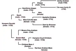 One account states that Ogle took Spark back to the American Colonies from England in the Spring of 1747.[18] Another says that Lord Baltimore gave the horse to Ogle "about" 1750.[17] This was Ogle's last tour of duty to replace Thomas Bladen, the past governor of the British colony of Maryland.[19] The pedigree of Spark is unclear and somewhat disputed. Historian Fairfax Harrison concluded that Spark was the product of the mare Miss Colville and stallion Aleppo.[2][20] Henry William Herbert records that Weatherby's Stud Book (General Stud Book) has Spark by Honeycomb Punch out of Wilke's old Hautboy mare, which is believed to be another name for Miss Colville.[1][21] The pedigree record bears the seal of Lord Baltimore.[22] It shows that Aleppo came from the Darley Arabian bloodline.[23] They also show that Queen Mab came from thoroughbred stock through Musgrover's grey Arabian.[24][25] Benjamin Tasker, Jr. claims he had handwritten records on May 20, 1758, from breeders associated with Spark concerning his pedigree.[26] The American descendant records of Spark shows he sired a line of horses claimed to be very fast.[5][12][27][13][28] By 1787, descent from Spark and Queen Mab was used in advertising to promote breeding stallions.[29]