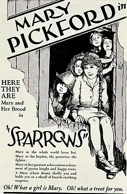 Sparrows is a 1926 American silent drama film about a young woman who rescues a baby from kidnappers. The film, which was originally titled Scraps, starred and was produced by Mary Pickford, who was the most powerful woman in Hollywood at the time.[2][3]