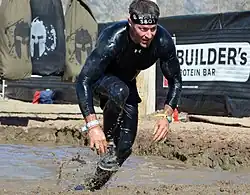 Spartan Race's main events include the Spartan Sprint (3+ miles of obstacle racing, 20+ obstacles), the Spartan Super (6+ miles, 25+ obstacles), the Spartan Beast (13+ miles, 30+ obstacles), and the Spartan Ultra (30+ miles, 60+ obstacles).[14] The obstacles themselves also vary from race to race. Frequently presented obstacles can include a fire jump, climbing under barbed wire, wall climbing, mud crawling,[15] the "over-under-through" (a series of obstacles in which runners must first climb over a wall, then under a wall, then through a square hole placed in a wall),[16] spear throw, rope climb,[17] heavy object carries,[18] "Herculean Hoist",[19] "Tyrolean traverse", monkey bars,[20] Traversal Wall (similar to a bouldering wall), Hobie Hop (a thick rubber band is placed around the ankles and participants hop through consecutive tires), Slip Wall (a wall built at an incline, roughly covered in grease), a zig-zag log jump, steep mud climbs (rolling mud), tractor pulls, underwater submerging below walls (dunk walls), Atlas carries, tire flips, stump balances (skipping on stumps across a pond), rope swing,[21] and the now discontinued Gladiator Arena.[22]
