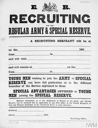 ![]() Recruitment poster for the British Army and Special Reserve | |